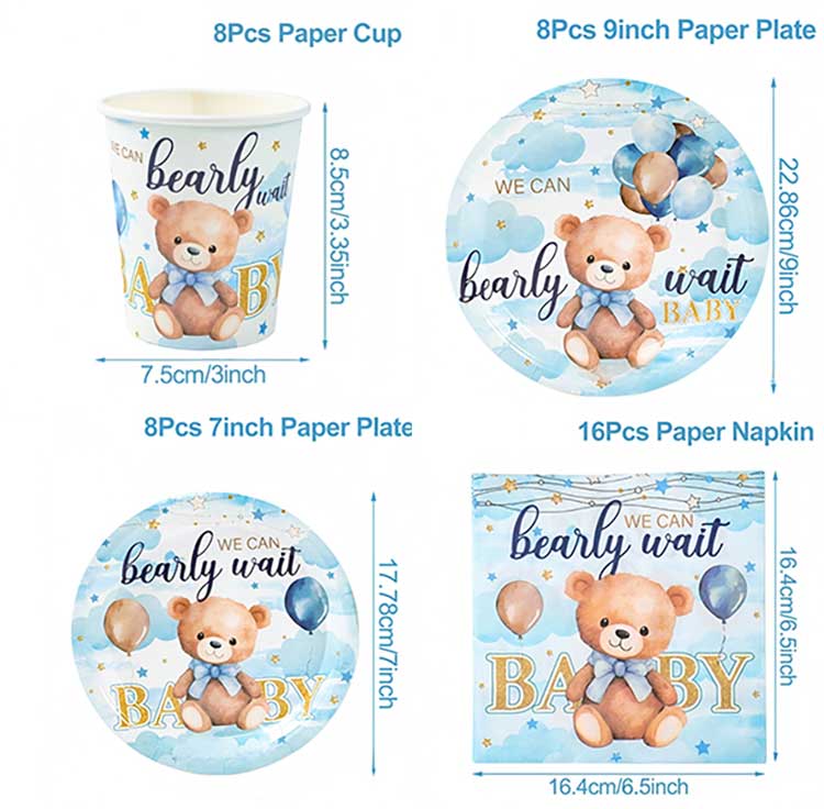 Mărimea setului de farfurii de unică folosință pentru ziua de naștere a bebelușului: Produsul este ambalat în pungi OPP, dar este disponibil și ambalaj de card de hârtie. Putem personaliza ambalajul în funcție de cerințele specifice ale clientului.