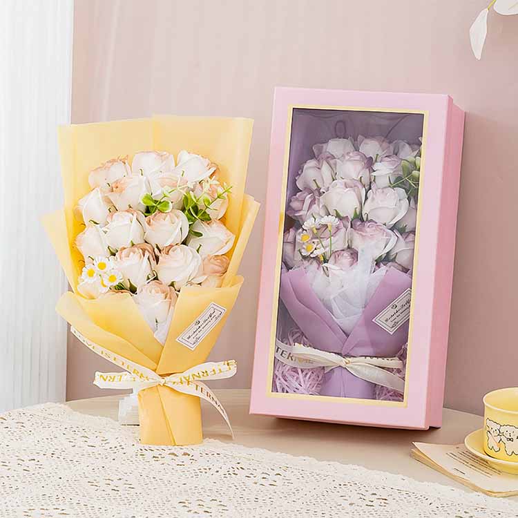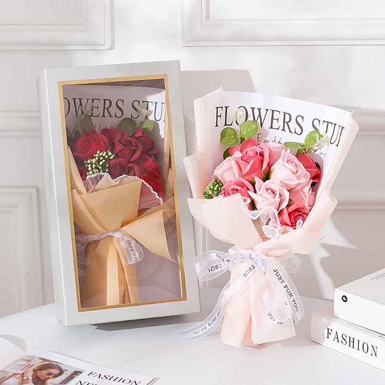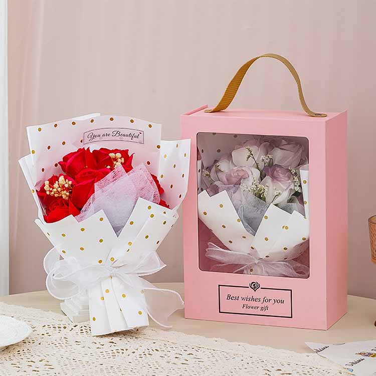 Cutia cadou buchet are ștanțare la cald, chenare transparente și materiale în relief, care pot face florile mai stratificate și de ultimă generație. Materialele folosite sunt carton, laminate și materiale ecologice, care sunt antipresiune și antideformare. În timpul oricărui festival, clienții pot cumpăra în funcție de nevoile lor, ceea ce este foarte rentabil.