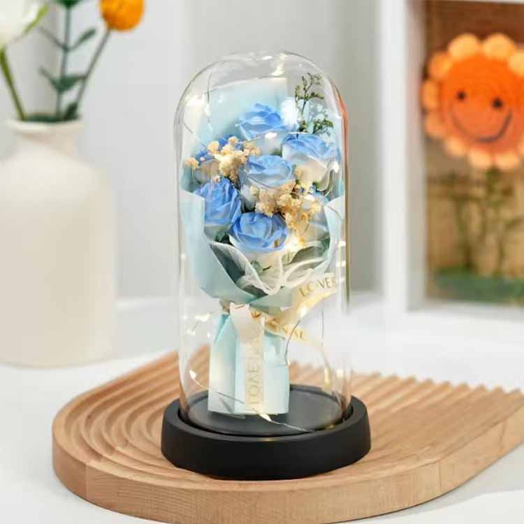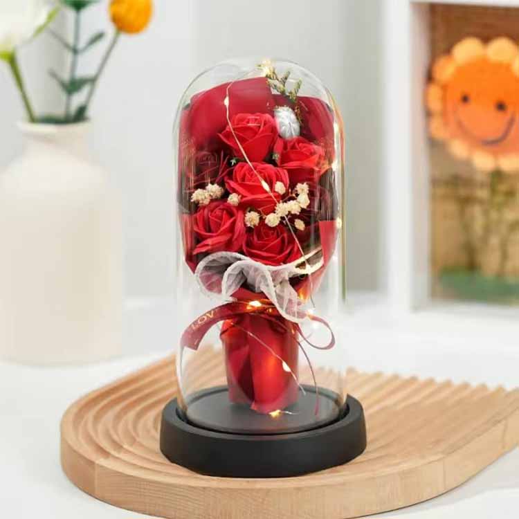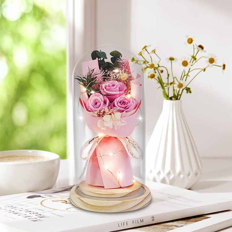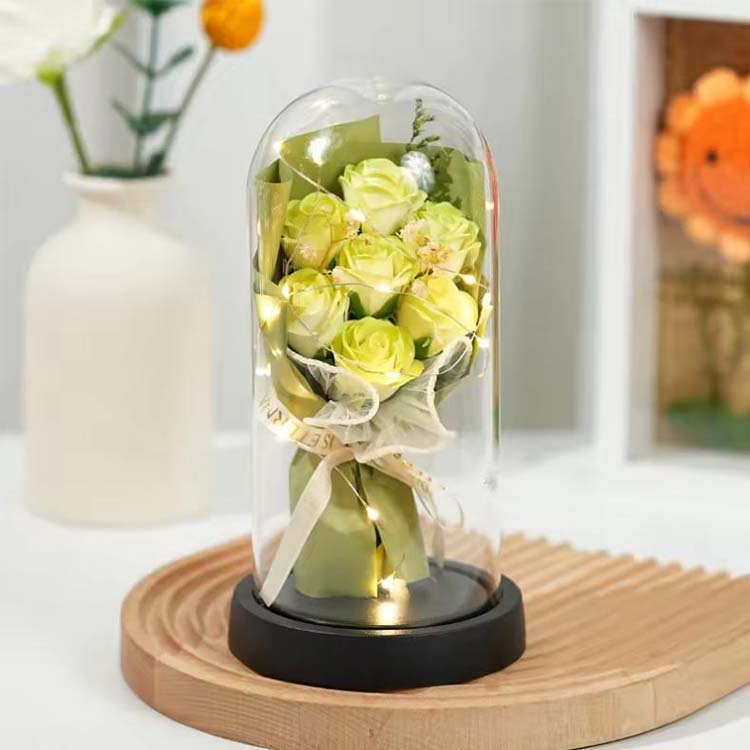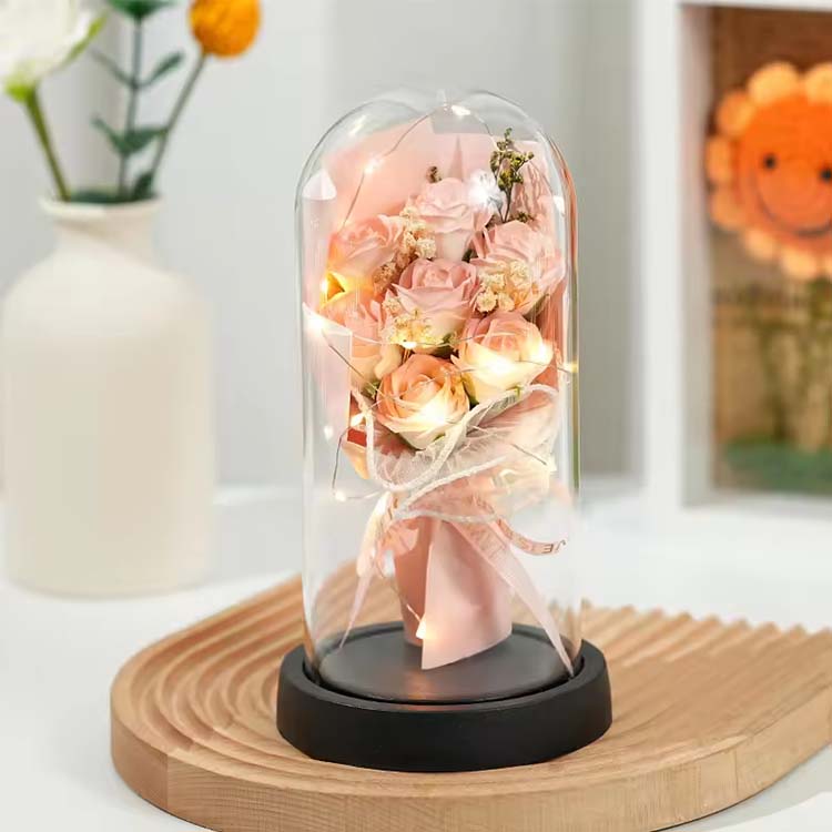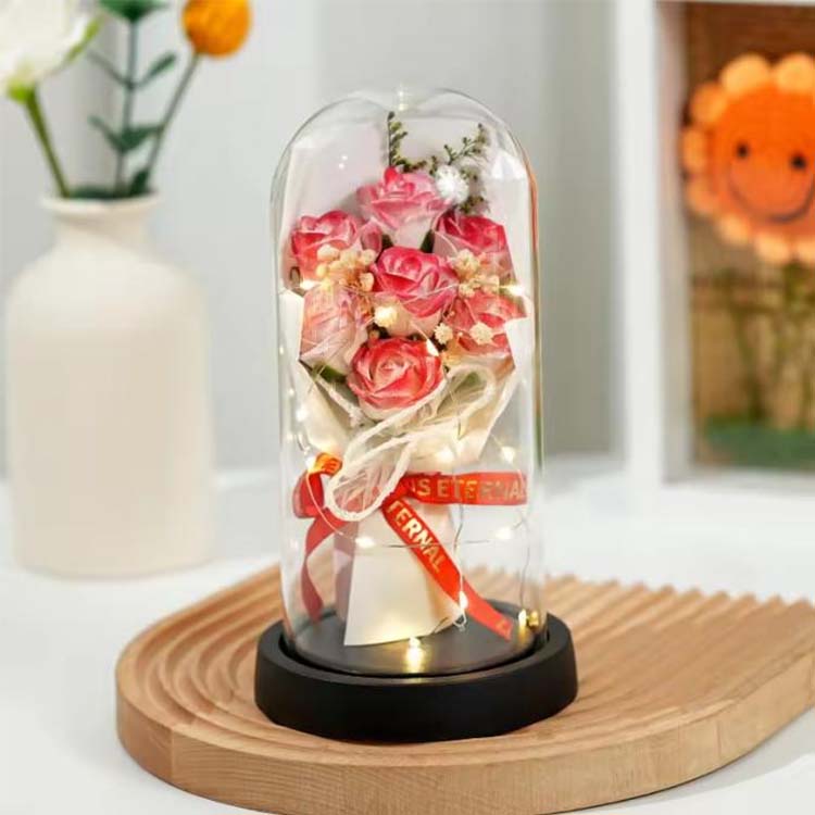 Buchetul de trandafiri de săpun cu cupolă de sticlă cu LED este folosit în combinație cu flori de săpun și flori conservate. Luminile cu LED folosesc lumină caldă și nefolositoare, care poate adăuga o atmosferă caldă la decorarea scenelor. Șirul de lumină LED încorporat are, de asemenea, lumini intermitente colorate, iar culorile pot fi personalizate pentru a satisface nevoile dumneavoastră. un cadou.Florile veșnice nu se vor ofili și nu își vor schimba culoarea nici măcar cu un capac de sticlă. Florile de săpun pot fi folosite și pentru spălarea mâinilor sau ca parfum. Acest buchet de trandafiri este economic și practic.
