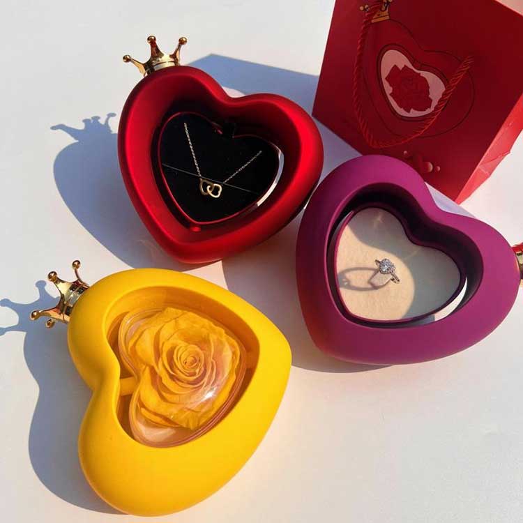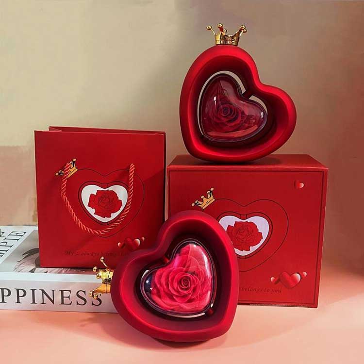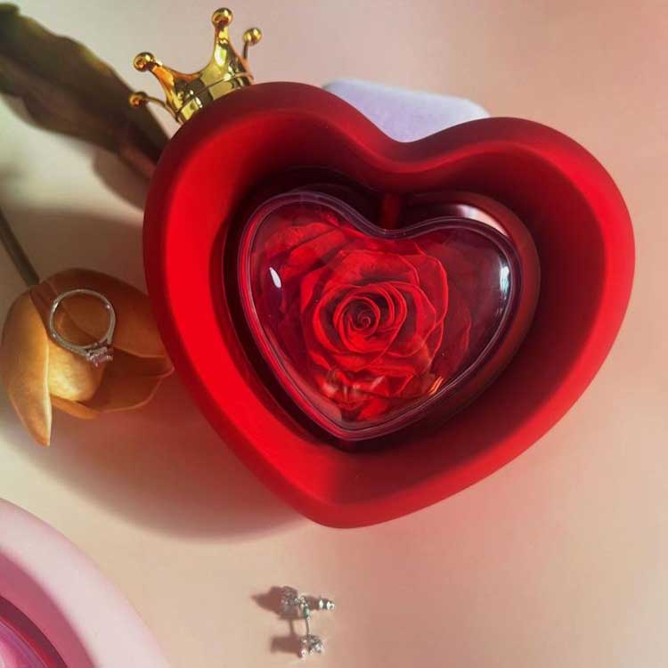 Cutia de bijuterii cu trandafiri în formă de inimă folosește flori conservate de gradul A, a căror culoare și textură nu se pot distinge de florile proaspete.