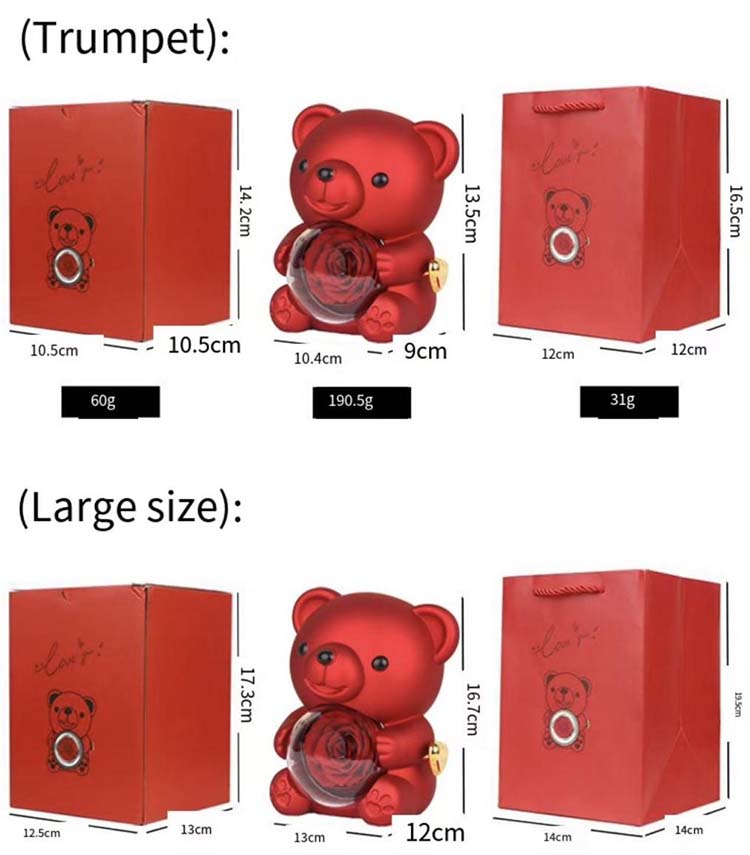 Ursul de îmbrățișare surpriză cu flori conservate vine în două dimensiuni: mare și mic. Poti alege marimea care iti place in functie de nevoile tale! Un lucru de remarcat este că colierul și inelul din imagine sunt elemente de recuzită pentru ședința foto. Cele două dimensiuni au propriile caracteristici, permițând fiecărei emoții să găsească modul potrivit de a le purta.