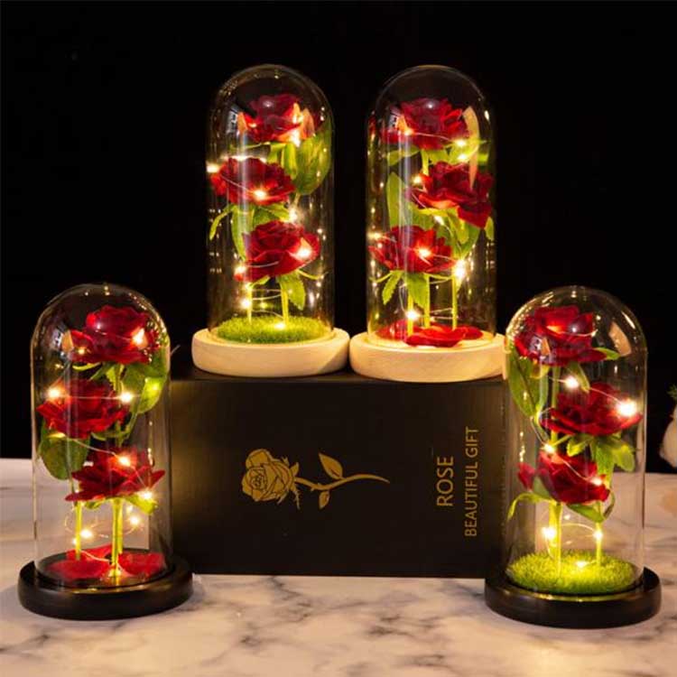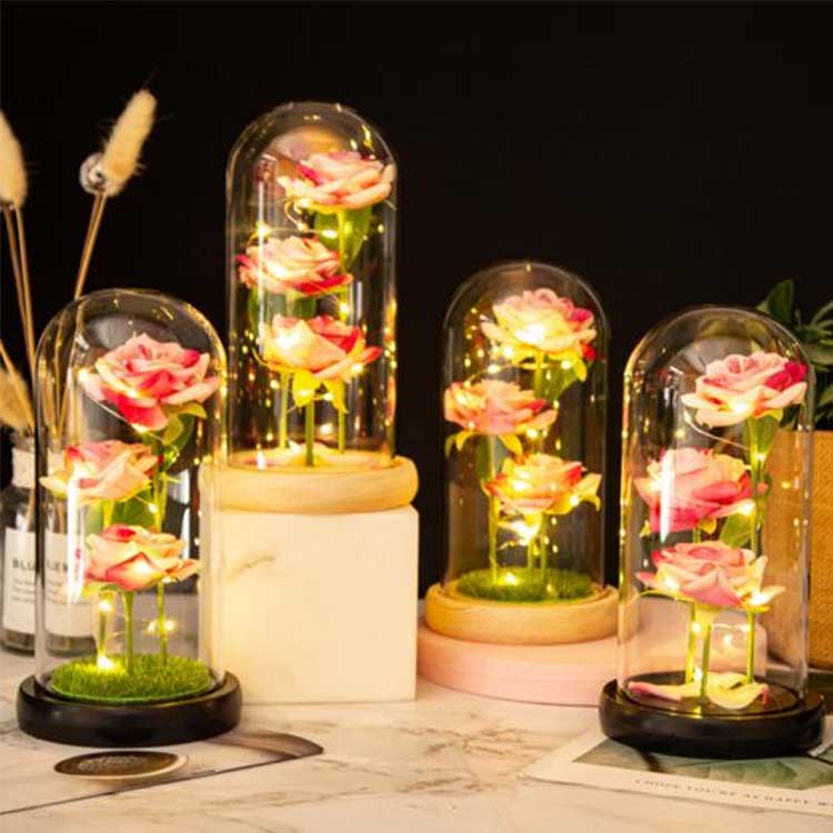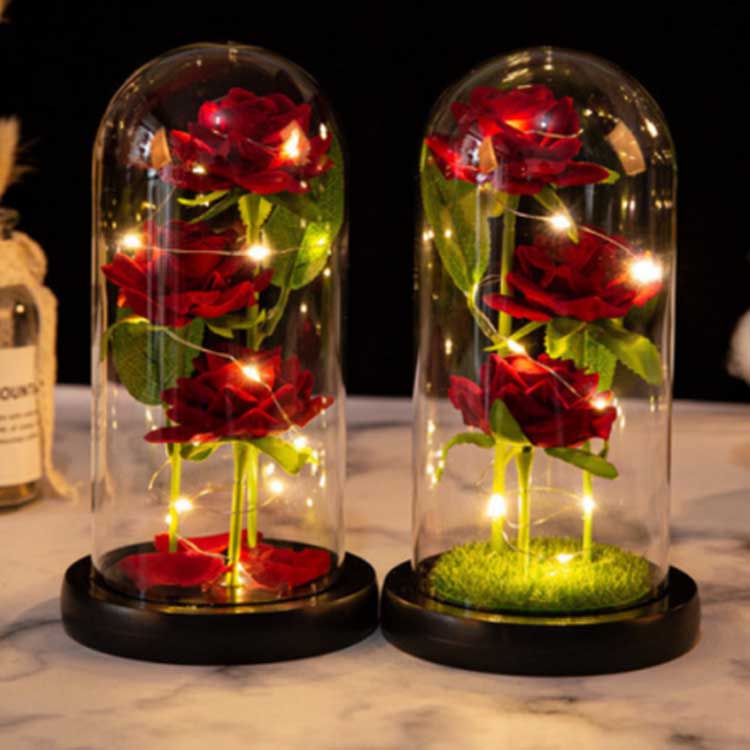 În interiorul cupolei din sticlă de trandafiri se află trei flori conservate așezate la înălțimi diferite, cu tulpini realiste și frunze verzi. Capacul din sticlă este rezistent la căldură și nu se deteriorează ușor. Luminile cu LED-uri au iluminare tare încorporată, iar întrerupătorul este situat sub baza din lemn pentru o operare ușoară. Potrivit pentru decorațiuni de nuntă și mobilier pentru casă, și poate fi oferit și ca un cadou de aniversare și de aniversare personalizat. card cadou.