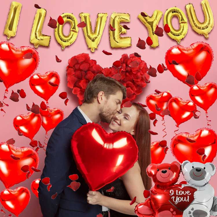 Baloanele din folie de Ziua Îndrăgostiților au sloganuri dulci precum „Te iubesc” și „Ziua Îndrăgostiților Fericiți”. Baloanele vin în folie vibrantă de roșu, roz și auriu, creând un efect tridimensional atunci când sunt umflate. Din punct de vedere vizual, prezintă o atmosferă de sărbătoare romantică. Pe lângă sloganuri, ele vin și în diferite forme, cum ar fi trandafiri, urși care îmbrățișează inimi și buze, printre multe altele. Puteți alege în funcție de decorul și stilul specific.